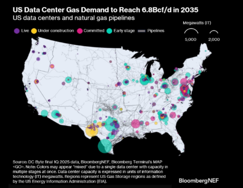 Current and Future. Currently, we use about 1.3Bcf per day for the data centers we have up and running. Most are in Virginia and they provide the “cloud” as we know it. (See accompanying chart showing map of U.S.) According to BloombergNEF and others, that demand will hit 6.8 Bcf per day in 2035.